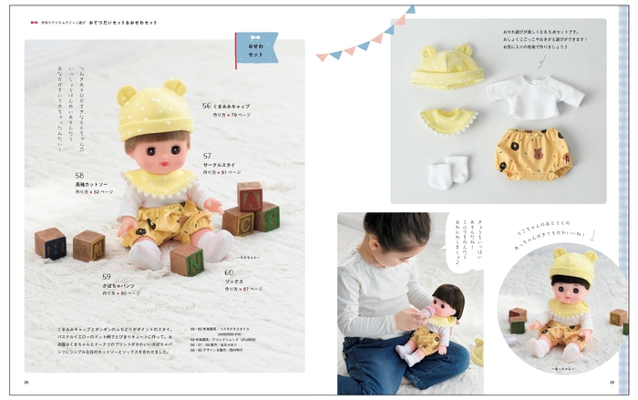 あどけない表情がかわいらしいメルちゃんと、おねんねが大好きないもうとのネネちゃん、ふたりとなかよしのおともだちにぴったりなお洋服とこものをご紹介しています。