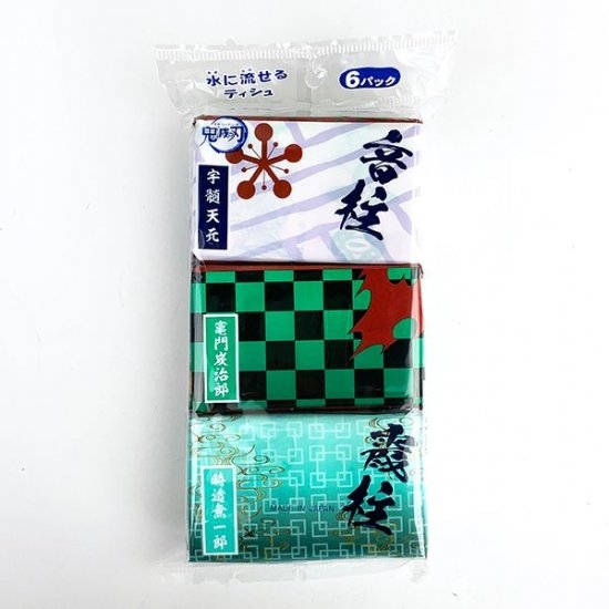 鬼滅のキャラクターをモチーフにしたデザインが、ポケットティッシュのパッケージに♪炭治郎を始め、柱たちのデザインのティッシュが6個セットになっています。
