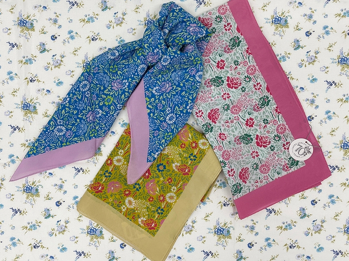 同柄のスカーフは、美しい色が際立つシルク100%。
