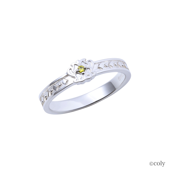 「魔法使いの約束」に登場する南の国の魔法使い、ルチルをイメージしたシルバーリングです。衣装のブローチをモチーフとしてリングに取り込んだウェーブタイプのデザインに、イメージカラーストーンをセット。内側には魔道具のアイコンを刻印しました。シンプルで普段使いしやすいデザインです。