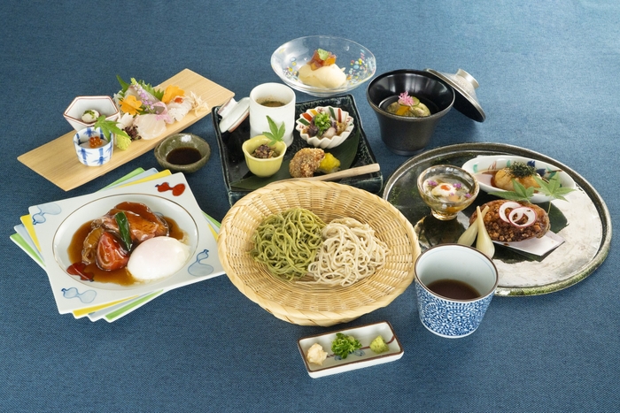 前菜には、淡路島産の鱧や、蛸、いちじくなど旬の味覚を組み合わせ、味噌チーズやガスパチョ風のアレンジで、素材本来の旨味を最大限に引き立たせた1品をご用意。メインには、淡路牛を使用した“冷やしすき焼き”をご提供いたします。淡路牛のきめ細かい霜降りに肉本来の甘みと香りを最大限に引き立たせ、山椒の爽やかな刺激が食欲をそそります。蕎麦は、伝統的な二八蕎麦に、海藻の中でも特に栄養価が高い“アカモク”や、豊富なミネラルと食物繊維を含む“長命草”など、鮮やかな色合いや風味を堪能できる“変わり蕎麦”を組み合わせてご提供いたします。