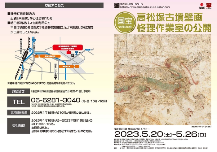 「国宝高松塚古墳壁画修理作業室の公開(第41回)」事務局にお電話いただくか、事務局ホームページにて、定員に達していない日時からご応募ください。