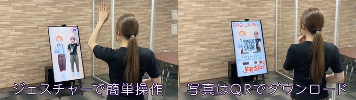 ・最新の姿勢推定AIエンジンを搭載し、操作は全てタッチレスで衛生的!さらに撮影した画像はその場でスマホに保存可能!
