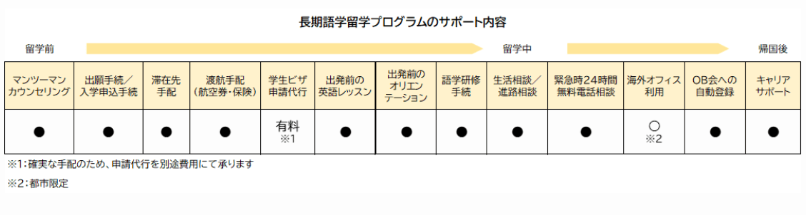 留学ジャーナルでは、お申し込み後に「プログラム費用」をお支払いいただき、留学に必要な手続きや手配などを留学前から留学中、帰国後までサポートしています。留学先の出願手続きや、滞在先、渡航手配、そのほか、事前英語レッスンや出発前オリエンテーション、留学中に相談窓口、帰国後の就活などのキャリア相談も受け付けています。
