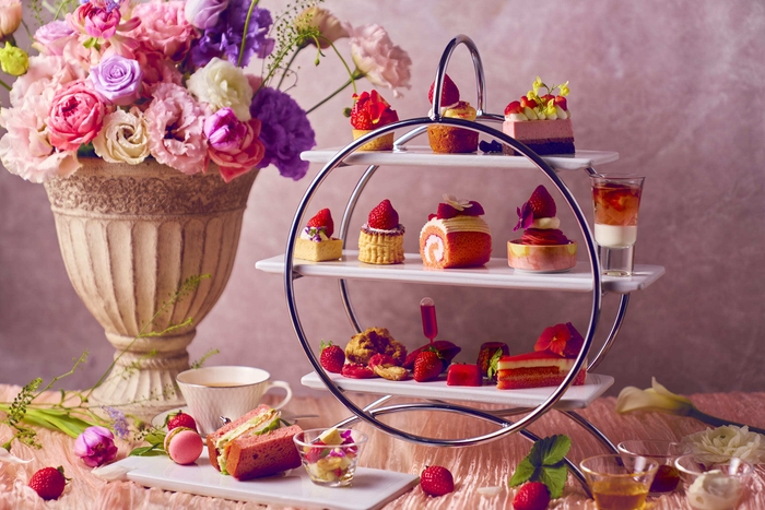 瑞々しいいちごとバラ・ラベンダーなど色とりどりのお花が織りなす、春の香りを詰め込んだアフタヌーンティー。いちごの甘酸っぱいフレッシュな味わいを最大限に引き立てるプティ・ガトー12種/スコーン/セイボリー3種をご用意しました。春色のカクテルや、いちご風味の生搾りモンブランは、オプションでご用意し、さらに贅沢なひとときを演出します。いちごの甘さと花々の彩りに包まれ、至福のひとときをお過ごしください。