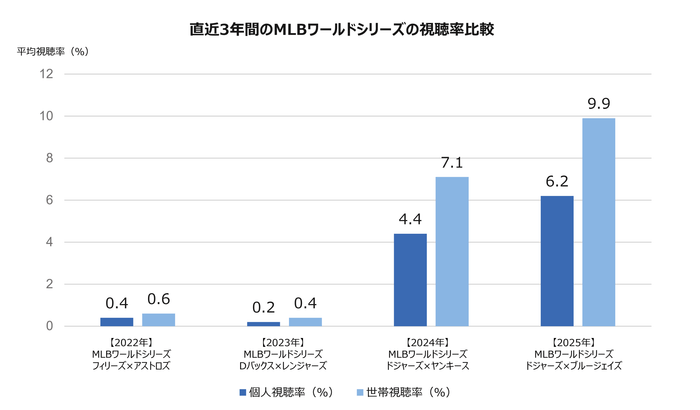 データを見ると、ドジャースがワールドシリーズに進出した2024年と2025年の視聴率が際立って高いことがわかります。特に今年2025年は、個人視聴率6.2%・世帯視聴率9.9%と過去4年間で最も高い視聴率を記録しました。