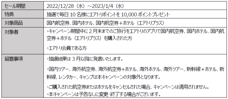 「2023エアトリ超新春セール」を開始!! ~第一弾として、国内旅行購入者限定で、毎日抽選で10名様に 10,000ポイントプレゼント!!~