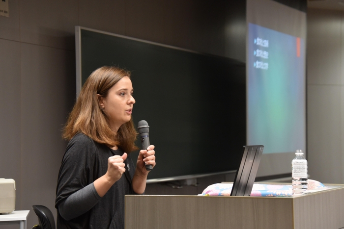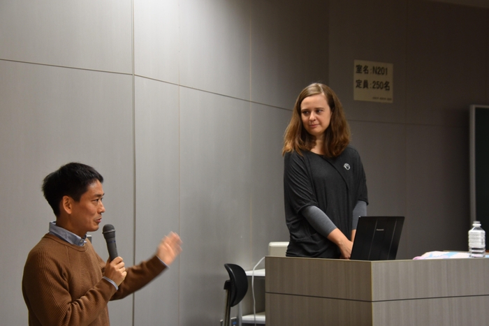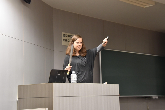 ナブロツカさんは社会学や歴史学、文学など幅広く日本の文化を研究しており、お弁当が日本人に与える影響の研究で修士号を、日本料理の流派「四条流」などの庖丁師による儀式「庖丁式」の研究で博士号を取得している日本研究者です。この日は学生約180人を前に、流ちょうな日本語で庖丁式やお弁当の変遷など日本の食文化に関する研究の成果を解説しました。