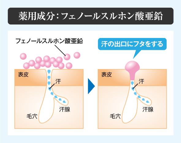 薬用成分フェノールスルホン酸亜鉛が汗の中のタンパク質と結合し、汗の出口にフタをして汗を抑えます。