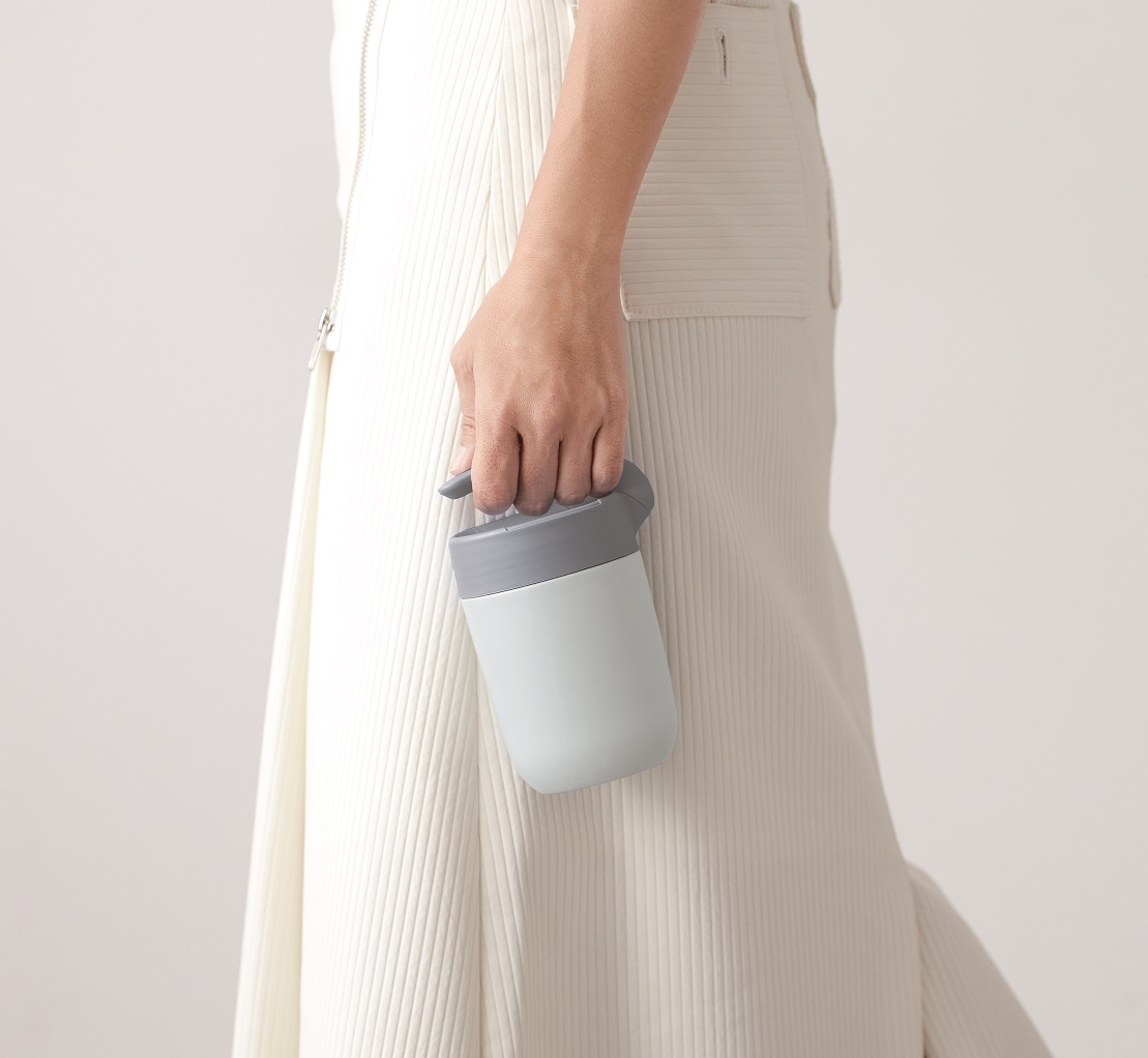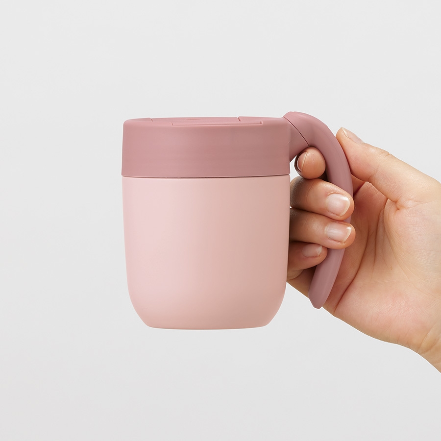 “くるっと”「ハンドル」を回すことで、利用シーンに合わせた使い方ができます。「ハンドル」を持ち運びしやすい位置に動かすことで、飲み物が入った状態でも安心して移動ができます。また、スライド式の蓋をずらすことで、両側2か所に飲み口ができる仕様の為、利き手に関係なく、ハンドルを掴み飲むことが可能です。本体カラーは、ジェンダーレスカラーを採用した4 色です。