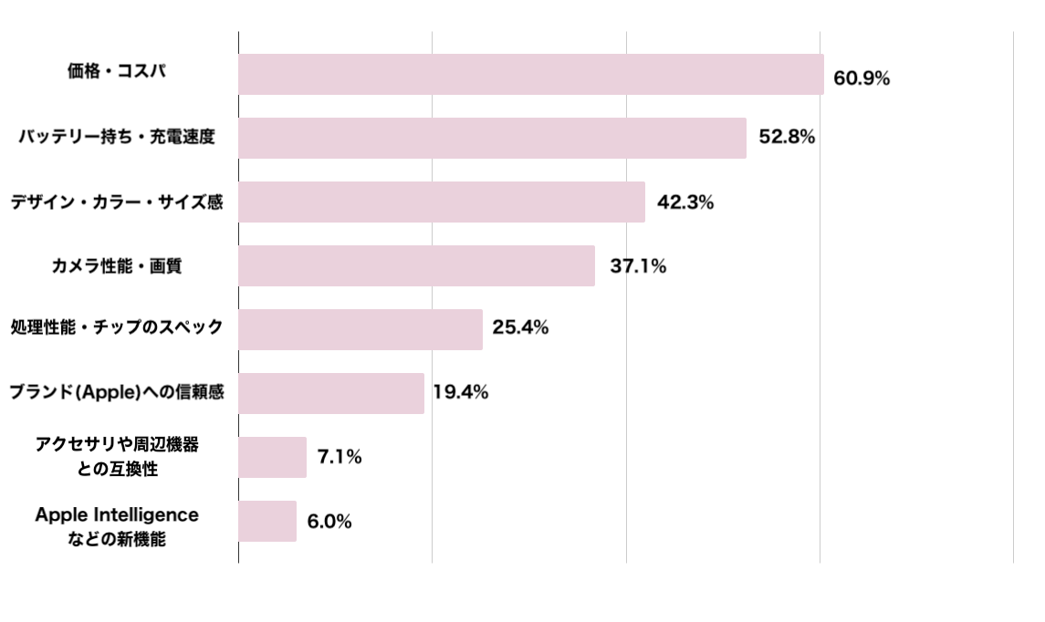 iPhoneを選ぶポイントについて聞いたところ、「価格・コスパ」が最多の約60.9%でした。