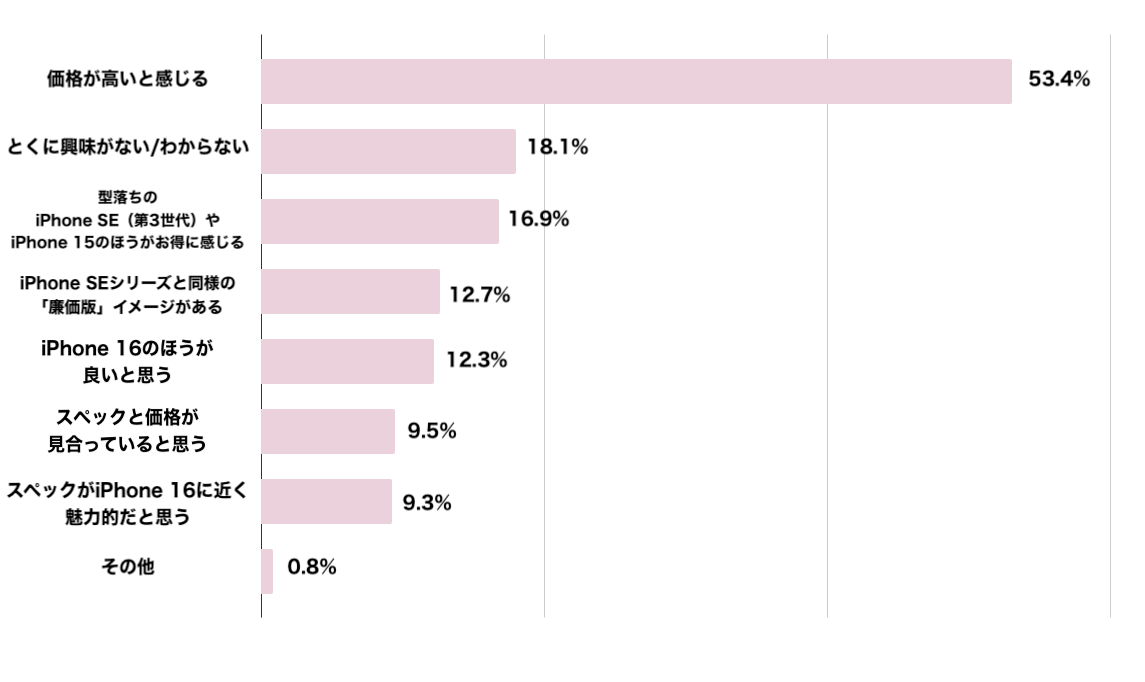 iPhone 16eの印象を聞いたところ、約53.4%が「価格が高いと感じる」と回答しました。