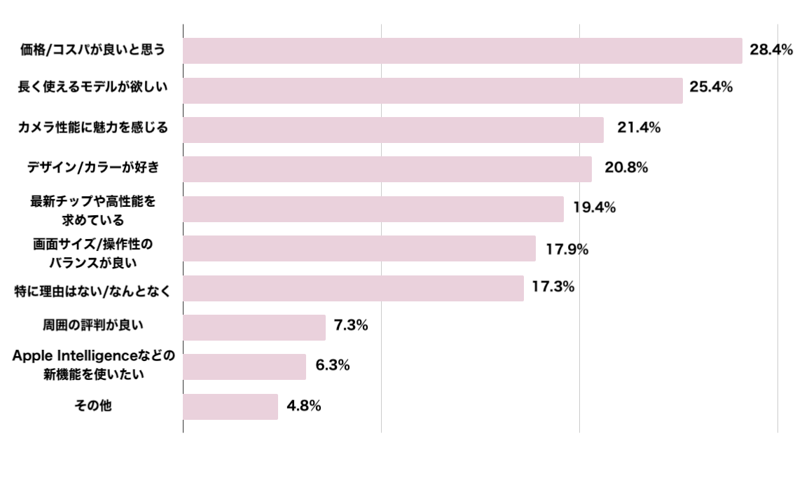 次に買い替えを検討するiPhoneを選んだ理由を聞いたところ、「価格/コスパが良いと思う」と回答した人が最多で約28.4%でした。