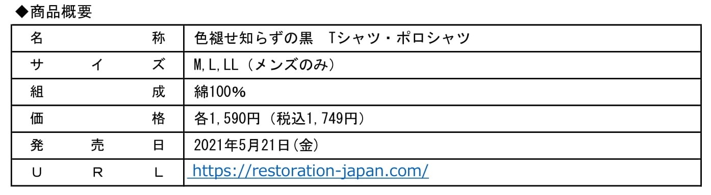 株式会社ドン・キホーテは、2021年5月21日(金)より、ドン・キホーテのアパレルブランド【RESTORATION(レストレーション)】の新商品、『色褪せ知らずの黒 Tシャツ・ポロシャツ』各1,590円(税込1,749円)を、全国のドン・キホーテ系列店舗(一部店舗を除く)において販売を開始します。