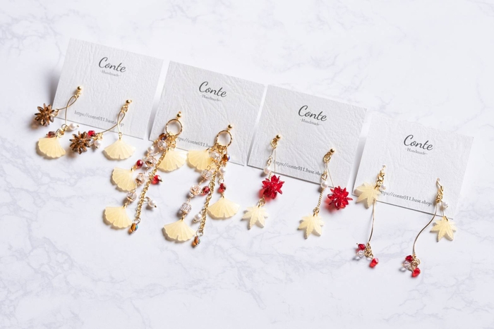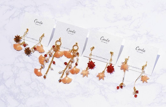 ハンドメイドアクセサリーブランドConteは、太陽光でお花の色が変化するアクセサリー「色づくお花シリーズ」の新作『色づく紅葉』が、WEBSHOP( https://conte011.base.shop/ )及び期間限定ショップ(店舗名及び期間につきましてはWEBSHOPに告知しております。)での発売が2022年9月21日(水)に迫っていることをお知らせします。2022年春と夏に限定発売され話題となった「色づくお花シリーズ」の第4弾。【四季を愉しむー色づく秋を身にまとってー】をテーマに日本の情緒あふれる紅葉の景色をピアスとイヤリングで表現。室内では黄色、太陽光の下ではほんのりオレンジに葉の色が染まります。はらはら落ちる紅葉のように揺れ感が楽しめるアクセサリーです。トレンチコートなどの秋色ファッションはもちろん、和装でも品良く合わせる事が出来ます。しとやかだけど存在感のある秋の紅葉。秋の陽でうつろう色模様をお楽しみください。