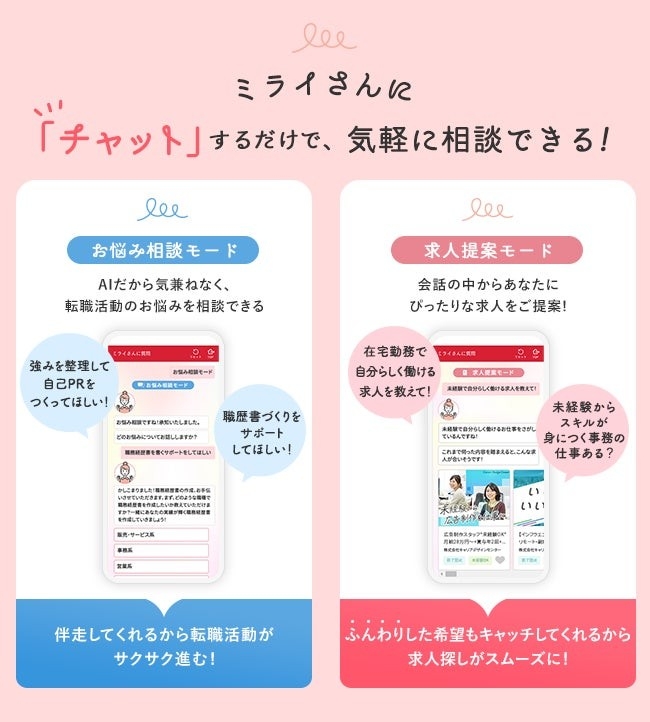 本サービスにより、求職者の方はミライさんと相談しながら転職活動を進めることが可能になります。ミライさんが最適な求人提案、職務経歴書や自己PRの作成、自分に合った職種・業界探しをサポートし、不安な転職活動に寄り添っていきます。