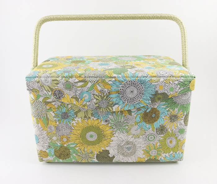ソーイング(布を縫って何かを作る)に必要な道具とおすすめの便利グッズ20点を、人気のブランド生地「LIBERTYプリント」のかわいいソーイングボックスに入れたセットです。