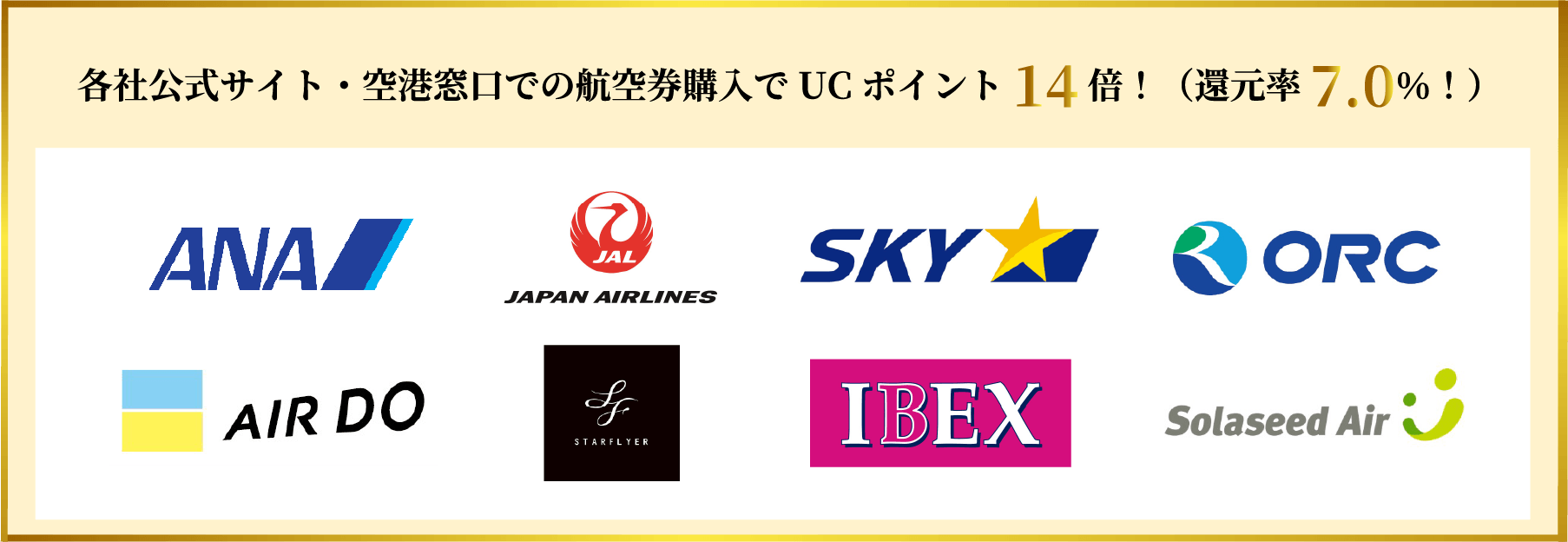 近年の旅行需要の回復を背景に、UCプラチナカードをお持ちの会員さまがより快適で充実した旅行体験をお得にお楽しみいただけるよう、航空会社を対象にポイントアップ店舗として取扱を開始します。UCプラチナカードを使用し、対象店舗で航空券を購入いただくと、ショッピング利用金額1,000円(税込)につき、UCポイントを14ポイント付与します。(通常還元率1.0%+ポイントアップ付与還元率6.0%=還元率7.0%)