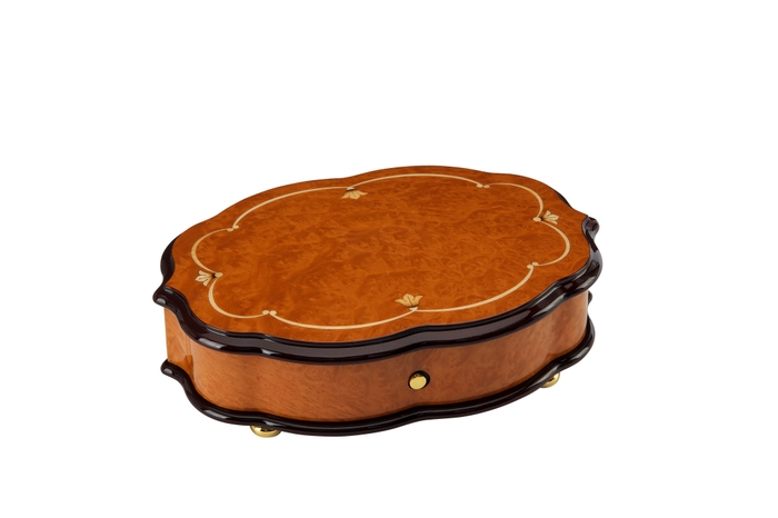 音の響きを司る重要な要素を持つボックス。長年人気を博してきたリーフ型に百合の象嵌細工を施した可憐なマドロナ材のボックスでお作りしました。楕円形のボックスは見た目と同様、優しくまろやかな音色を響かせます。クラシックの名曲を心に響くオルゴールの音色でお楽しみください。