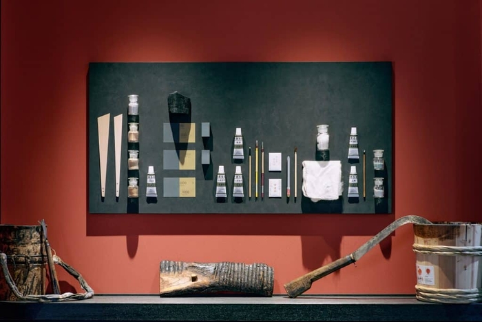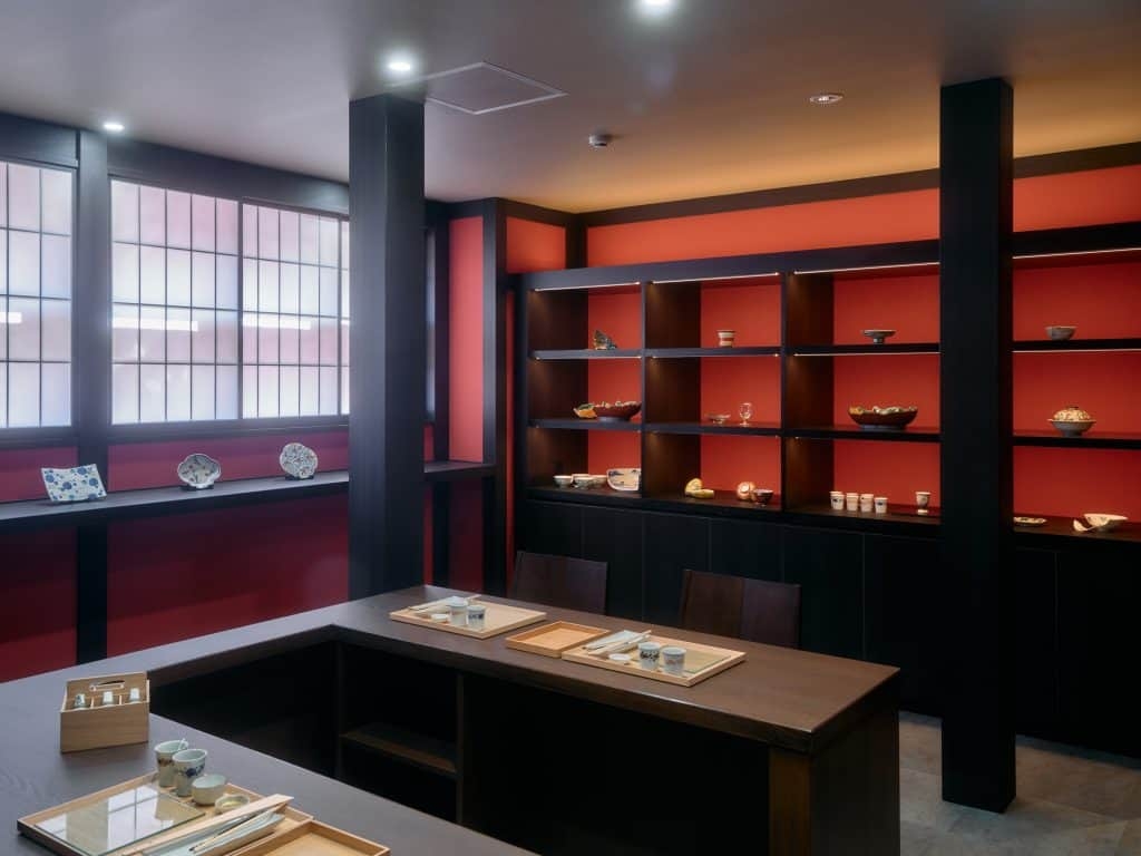 紅殻格子が特徴の界 加賀の伝統建築棟は、国の登録文化財で、文政年間(1818~30年)に建築されたと言われています。金継ぎ工房誕生にあたってのリニューアル工事は、紅殻色を基調とした外観はそのままに、表通りからの景観との一体感にこだわりました。窓からはスタッフが器を修復している様子を見ることもできます。また、内装も格子の色と合わせた紅殻色の壁とし、壁には実際に金継ぎで使う道具類を展示しています。展示している道具や器は、金継ぎや漆の専門家からの助言のもと、1点1点念入りに揃えました。