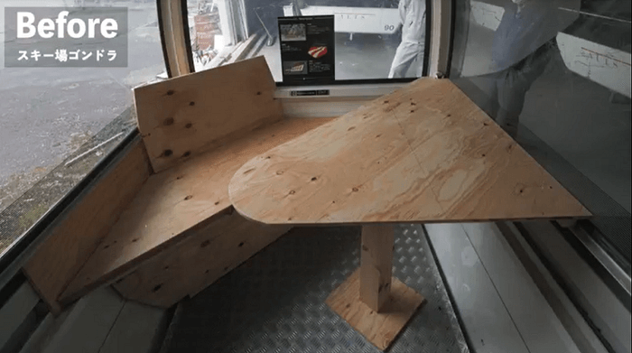 太陽の光に照らされた紅葉が美しい秋のリゾナーレ八ヶ岳に、トラックに乗ってアルツ磐梯から到着したゴンドラ。ひとつひとつ、ピーマン通りの広場に運び込まれます。朝には何もなかった広場に、夕方にはあっという間にテレワークゴンドラが設置されます。内装は、8人乗りだったゴンドラのベンチから、ゆったりと座れるソファに変更。資料や仕事アイテムを広げられる十分な広さのデスクを備えました。スキー場で活躍していたゴンドラが、リゾナーレ八ヶ岳で「テレワークゴンドラ」として誕生しました。