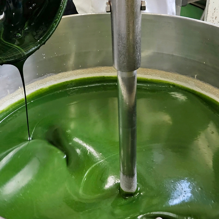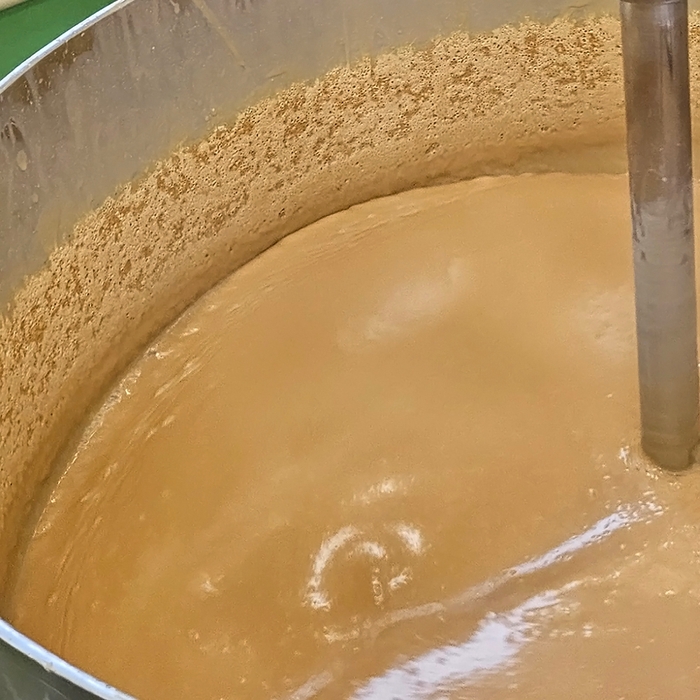なめらかな口当たりにするために、抹茶はふるい、水あめの中に少しずつ手作業で攪拌。鮮やかな緑色と香りをいかすため、抹茶は仕上げ直前に混ぜ合わせ、クリーミーな硬さになるまで時間をかけて濃縮しました。