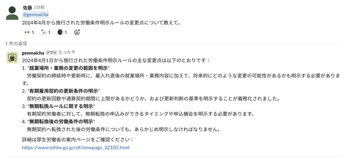 ▼ SlackでのAIチャット利用例
