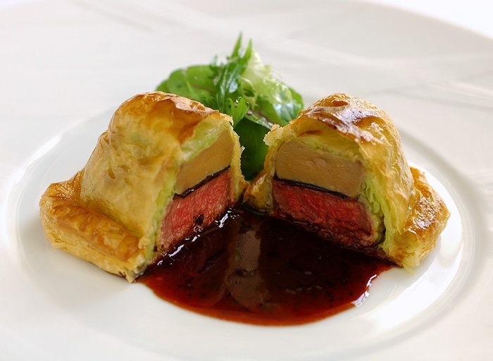 当店ではスペシャリテの『特選牛フィレ肉とフォアグラ・トリュフのパイ包み』とロイヤルブルーティーの青茶(ウーロン)をおすすめしています。濃厚なフォアグラとトリュフの芳醇な香りが、奥行のある青茶をとよく合います。またスモークサーモンには香ばしいほうじ茶を、魚介類にはすっきりとした緑茶など、マリアージュも多数あり、ノンアルコールドリンクの世界は奥深いです」
