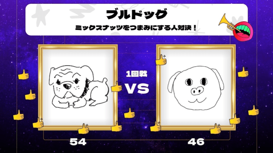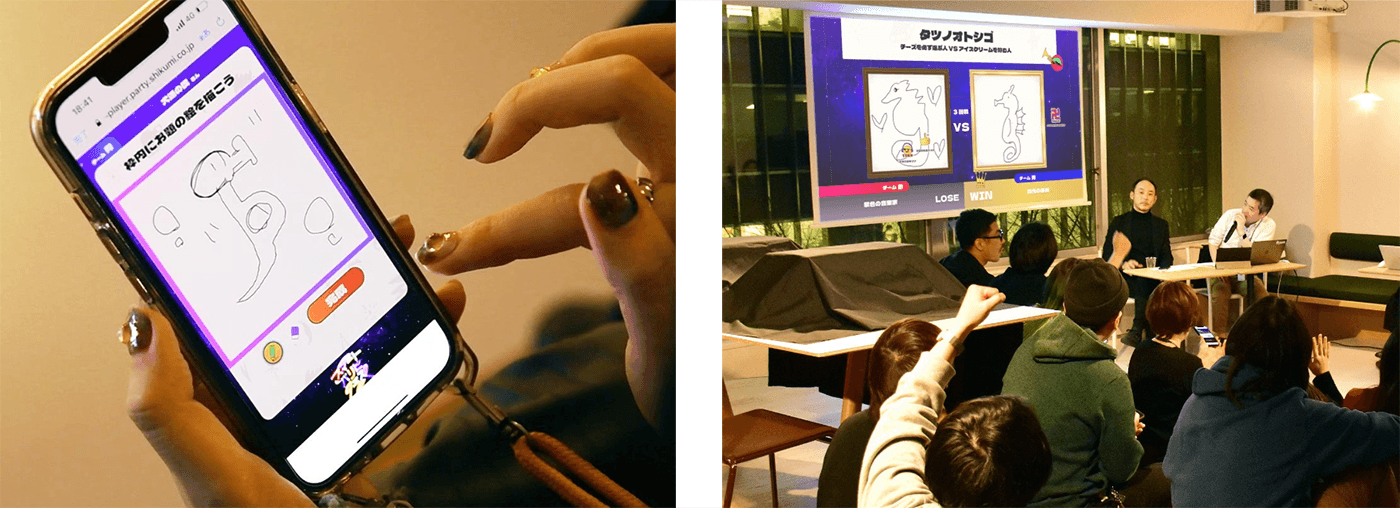 「あいまいブレインスケッチ」は、参加者が二つのチームに別れ、記憶を頼りにお題の絵を描き対戦するゲームです。参加者全員が制限時間内にスマートフォンの画面に指でお題の絵を描くと、AIが両チームの代表となる絵を選別しメインスクリーンに投影されます。勝敗は、絵のリアルさや面白さなど、司会者が任意の判定基準で参加者に問いかけ決定されます。