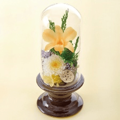 上品な陶器の台座の上にガラスドームを載せた新しいスタイルのお供え花。明るい色調のモダンなデザインで、現代風仏壇にもマッチ。ドームがプリザーブドフラワーをホコリからガードし、長く美しい状態を保ちます。