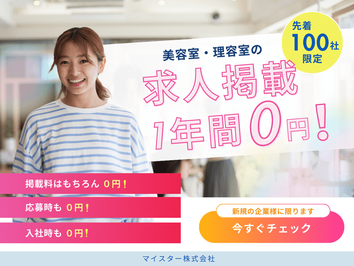 このような状況を受け、マイスター株式会社では、美容室・理容室業界の採用活動を全面的に支援するため、求人掲載費用を1年間完全無料とする特別キャンペーンを企画いたしました。このキャンペーンを通じて、最低賃金引き上げによる経営負担の軽減と、業界全体の人材確保・定着率向上に貢献することを目指します。