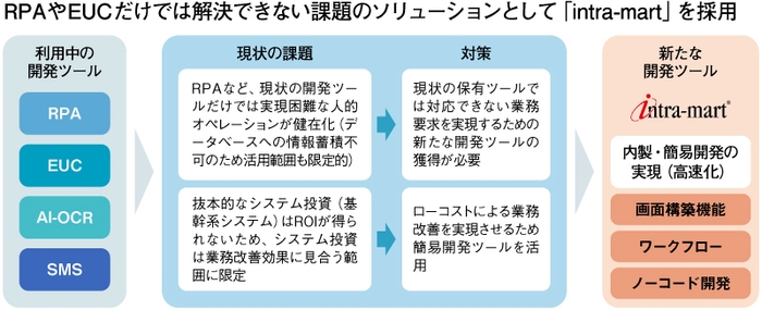 トヨタファイナンス社は、トヨタグループの中で国内唯一の金融会社として、金融およびクレジットカードサービスを幅広く展開し、近年では格付投資情報センターにおける長期格付で「AAA」という高評価を獲得しています。事業環境の変化に合わせて、RPAやExcelのマクロ機能などのEUC(エンドユーザーコンピューティング)を活用し、個々の社内業務を効率化するようシステム整備を行う中で、紙の書類をベースとした膨大な業務プロセスが課題となり、ワークフローを軸としたローコード開発ツールの導入の検討を開始しました。その結果、広範囲で業務プロセスをカバーし、社内業務の「KAIZEN」を推進することができるデジタル基盤にintra-martを採用しました。