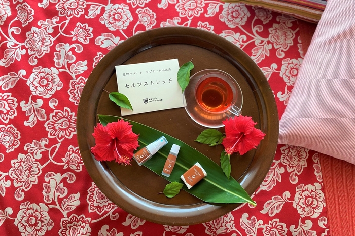 沖縄でのアクティビティを満喫するためには、睡眠不足は最大の敵です。離島での滞在を思う存分楽しんでいただけるよう、十分な睡眠をとるため就寝前のストレッチ指南書やアメニティの他、月桃ハーブティーを用意します、身体をストレッチでほぐし、ハーブティーで温めることで心地よい眠りへと誘う安らぎの時間です。