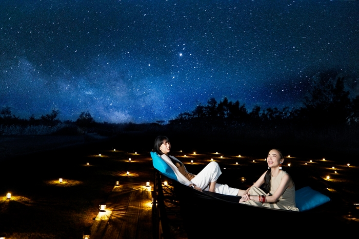 小浜島は「星空保護区」(*3)に認定され、21個ある1等星の全てと88星座中の84星座を見ることができます。満天の星を眺めるために、周りに高い建物がなく、人工光の入らない開けた空が臨める場所に、全長50mの「ティンガーラハンモック」を用意。ハンモックに寝転がると、頭上には壮大なティンガーラを眺めることができます。心地よい風を感じながら満天の星を眺め、心落ち着くひと時を過ごせます。