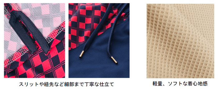 ウェア全体にはUVケア最高値であるUPF50+を搭載し、さらに紫外線の9割を占める日焼けの原因となるUV-A波も大幅にカットする素材を使用しています。品質にもこだわり抜き、色落ちしにくく、耐久性にも優れた国産生地を用いて国内で生産しております。