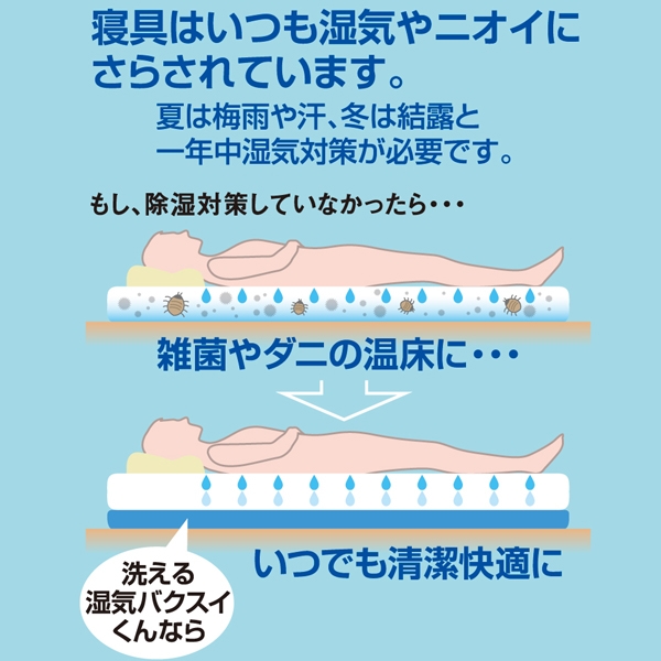 もし、除湿対策していなかったら・・・雑菌やダニの温床になるかもしれません。洗える湿気バクスイくんで寝具のケアをご提案致します。