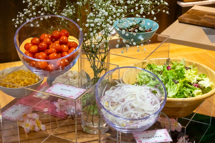 シーザーサラダ、コールスローサラダ、トレビス、プチトマト、オニオンスライス、コーン、ポテトサラダ、アボカドと海老のサラダ、チキンとキノコのサラダ、アスパラ、ピクルス