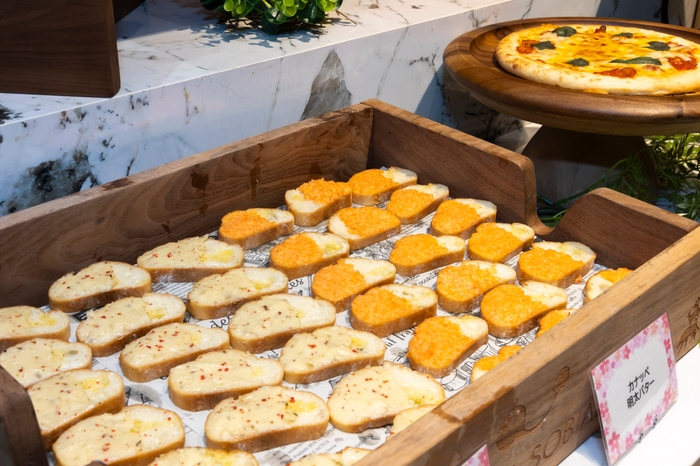 すりたての生ハム、焼き立てピザ、カポナータ、カマンベールフライ、ミニラザニア、トマトとバジルのカッペリーニ、シークワーサー香るトマトパスタ、ブルスケッタ(カプレーゼ風)、カナッペ(ガーリックバター・明太子バター)、シェフのおすすめ(マグロとアボカドのインボルティーニ)、ソビアル特製 ピクルス、サラダ各種、パン各種、ビシソワーズ、苺ムースタルト、マロンケーキ、抹茶羊羹、雪塩キャラメルプリン等