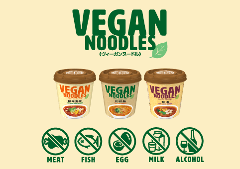 ヴィーガンヌードルは、肉・魚などの動物性食材やアルコール不使用のカップ麺ブランドです。東京・自由が丘ヴィーガン料理専門店「T’sレストラン」に監修いただき、野菜・香辛料などの素材のおいしさを活かすことで、動物性食材不使用とは思えないコク深い味わいをつくりだしています。