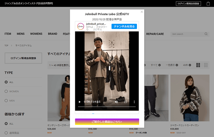 コロナの影響も関係しているのか、アパレル商材に限らずInstagramでエンドユーザーとのコミュニケーションを活性化させる動きが各社見られます。特にインスタライブ(IGTV)は、ニューノーマル時代の新たな打ち手と言えそうです。ただし、Instagramは商品を画像や動画で紹介することができても、商品ページに動線を設けるなどオンラインショップ内に誘導することができません。また、インスタ上でのライブ配信はリアルタイム視聴したユーザーの目以外に接触する機会が多くはありません。