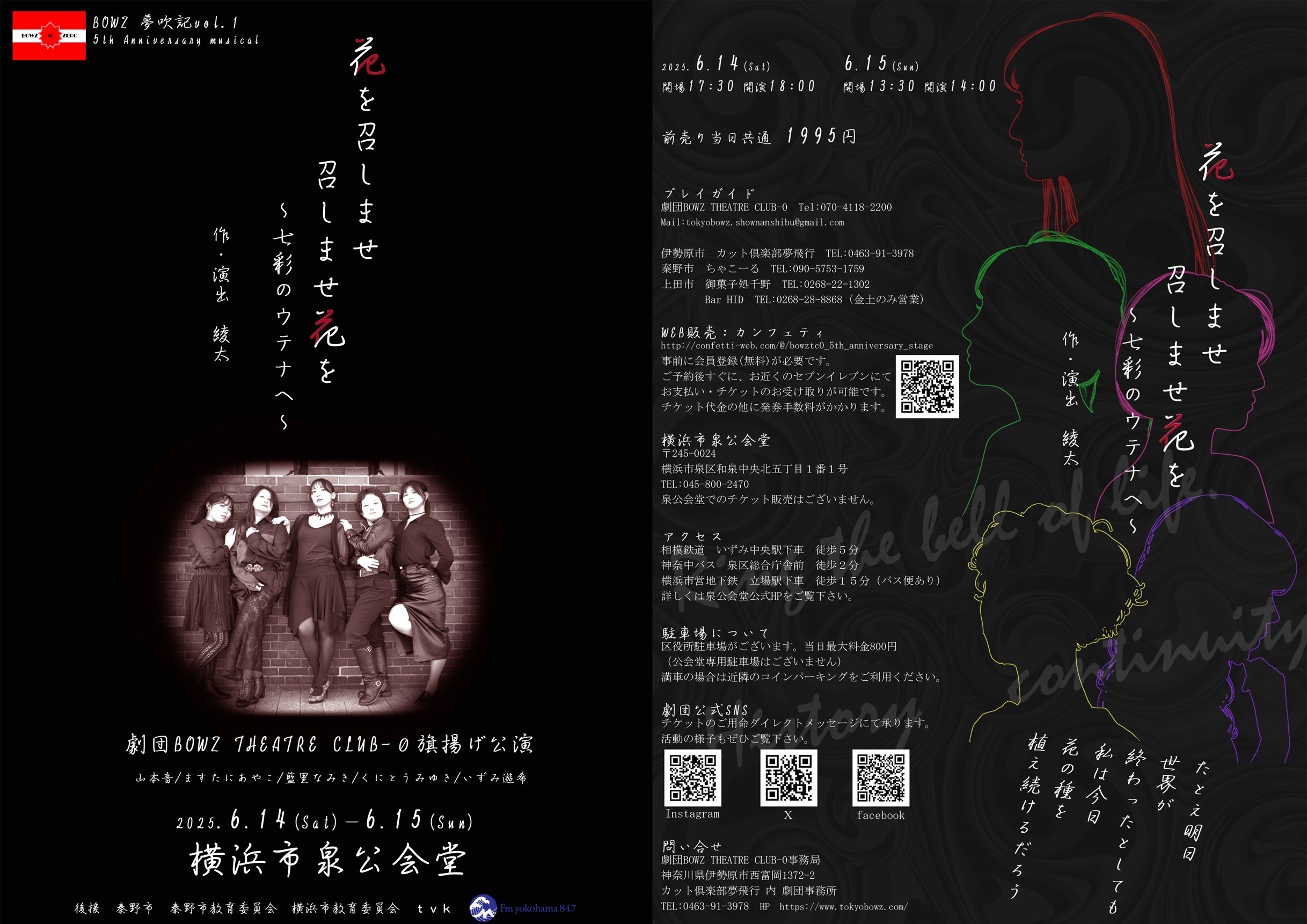 劇団BOWZ THEATRE CLUB-0『花を召しませ 召しませ花を』が2025年6月14日 (土) 〜 2025年6月15日 (日)に横浜市泉公会堂(神奈川県 横浜市泉区 和泉中央北 5-1-1)にて上演されます。