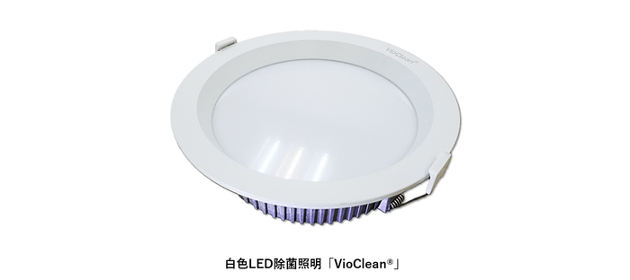 VioClean(R)は、人体に完全無害な普通可視光の中の特定波長(405nm)を用いてコロナウイルス(SARS-CoV-2)や細菌の除菌、不活性化を実現するLED除菌照明です。照射時間や取り扱いに注意が必要な紫外線(UV-C)の照射による除菌灯と異なり、不特定多数の人が行き交う場所でも、一般的な照明のように使用しながら24時間点灯・除菌することが可能です。また、紫外線照射装置と異なり、カートリッジ交換などが不要でメンテナンス性も高く、シンプルな施工で複数台設置でも半日程度で済むなど、設置工事も容易です。