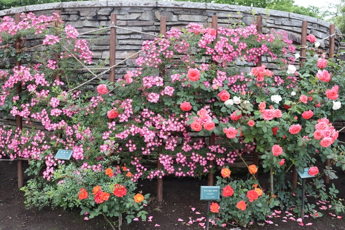 レンガと大理石を使った東欧風のバラ園は、約110種類450株の色とりどりのバラが咲く園内の人気スポットのひとつです。