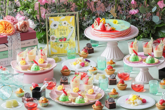 アフタヌーンティーのように美しく並べられたスイーツの数々は、デザートブッフェのように、お気に入りスイーツを見つけたら“おかわり”のオーダーが可能。また、お客様のテーブル上で、 「ストロベリーネバーランド 恋するティンカーベル」の世界観を表現しており、席を立つことなく、安心・安全にお過ごしいただけます。
