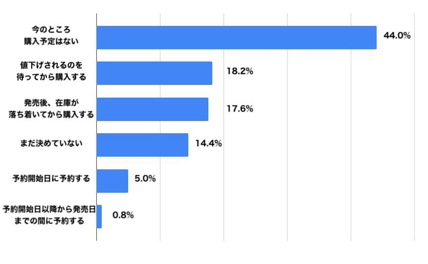 「予約開始日に予約する」と回答した人は5.0%、「予約開始日以降から発売日までの間に予約する」と回答した人は0.8%でした。