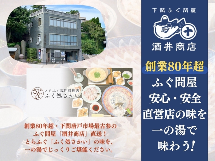 使用するふぐは、山口県下関の老舗「酒井商店」から直送された鮮度抜群のとらふぐ。創業80年以上の歴史を持ち、「ほんとうに良いものだけを提供する」という社是のもと、安心・安全な品質のふぐをリーズナブルな価格でご提供します。長年培われた目利きと加工技術によって仕上げられたふぐ刺しは、芸術品のような美しさと、旨味・歯ごたえのバランスが特長。また、酒井商店直営の人気店「ふく処さかい」で提供される味を、箱根の温泉宿で堪能できる特別な機会です。