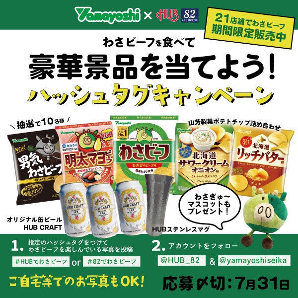 株式会社ハブ(本社:東京都千代田区、代表取締役社長:太田 剛)は一部店舗において、山芳製菓株式会社(本社:東京都板橋区、代表取締役社長:山﨑光博)の人気スナック菓子「わさビーフ」と期間限定でコラボレーション企画を実施いたします。