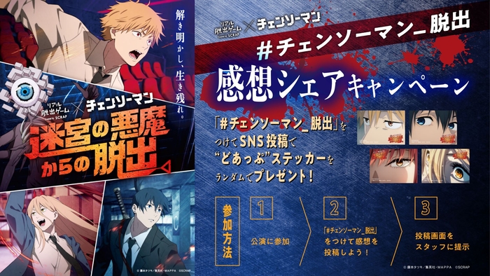 全世界で累計1,300万人以上を動員しているリアル脱出ゲームを企画制作する株式会社SCRAP(本社:東京都渋谷区、代表:加藤隆生)は、TVアニメ「チェンソーマン」とコラボレーションしたリアル脱出ゲーム『迷宮の悪魔からの脱出』の開催を記念して、感想シェアキャンペーンを実施することを発表いたします。