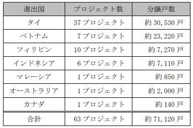 当社では現在ASEAN諸国を中心に海外における不動産事業を強化すべく、さまざまな取組を進めています。そのうち住宅分譲事業は、これらのプロジェクトへの参画により総計63プロジェクト(約71,120戸)となります。