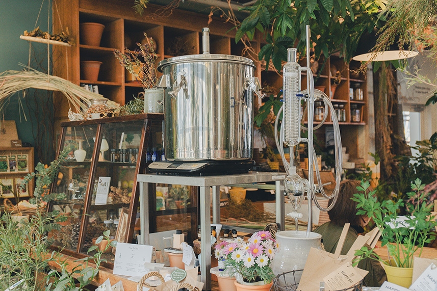 HERB SHOPの店内に入ってすぐお迎えしてくれるのは、大きな蒸留器。